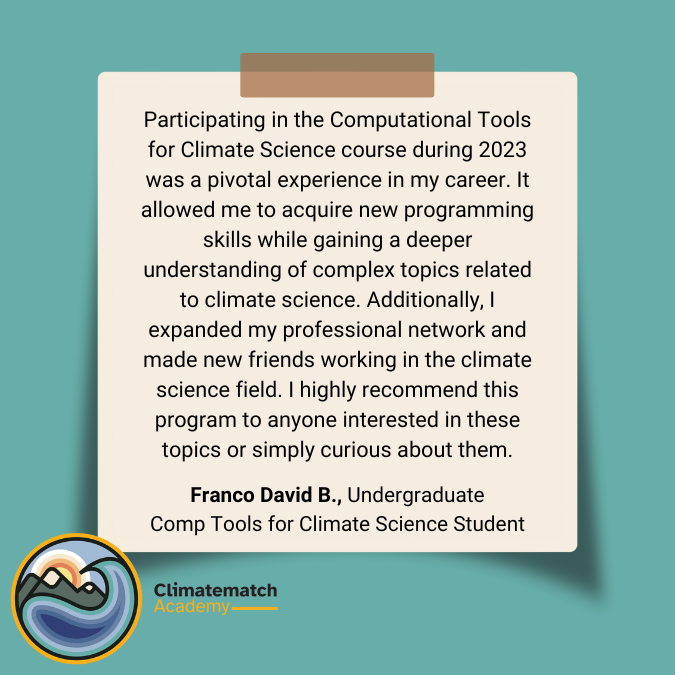 | Computational Tools for Climate Science | Through this program, students will gain skills and knowledge in the areas of climate science and impact, computational methods, data access, and scientific practices. See prerequisites here. | See Course Details and Upcoming Dates | 13-24 July, 2026 |